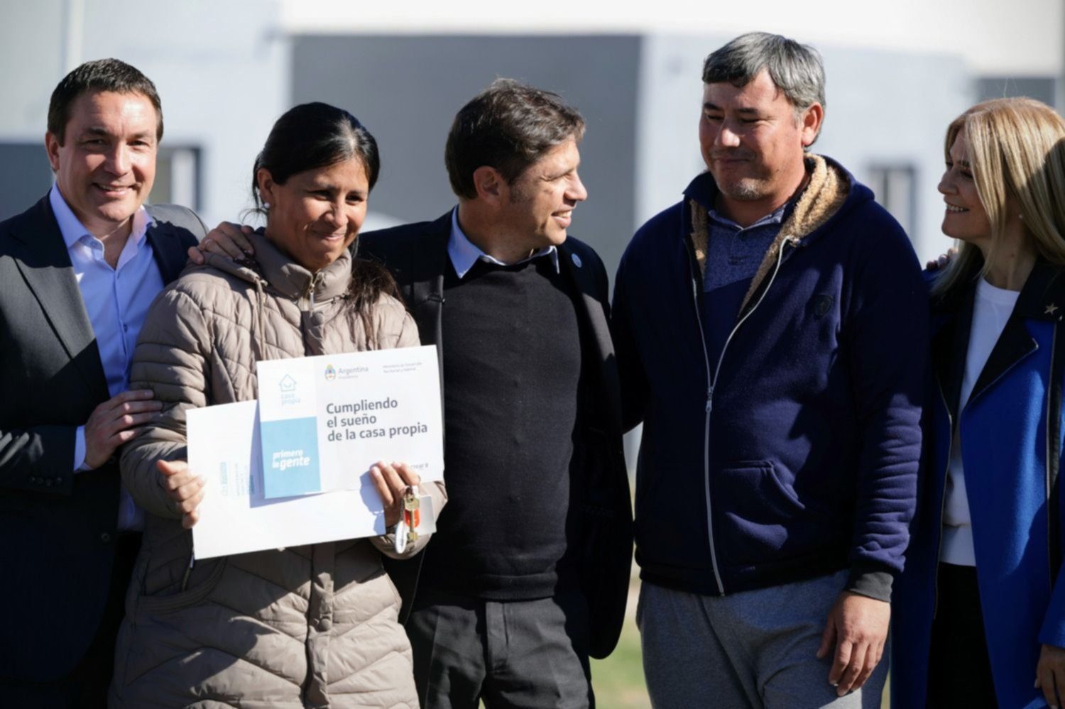 El gobernador de la provincia de Buenos Aires, Axel Kicillof, encabezó esta mañana el acto de entrega de 62 viviendas a familias del barrio Las Margaritas, en Florencio Varela. Fue junto a la vicegobernadora Verónica Magario; el ministro de Desarrollo Territorial y Hábitat de la Nación, Santiago Maggiotti; su par bonaerense de Hábitat y Desarrollo Urbano, Agustín Simone; el intendente local, Andrés Watson; y el presidente de la Federación de Cooperativas de Trabajo Unidas (FE.COO.TRA.UN), Christian Miño.