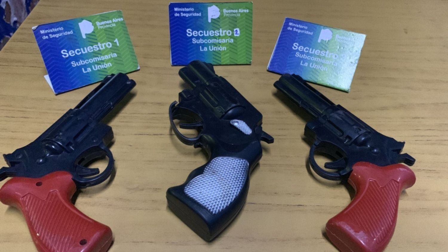El insólito episodio ocurrió en 32 entre 142 y 143 y en el operativo participó personal de la Subcomisaría La Unión. Los elementos incautados fueron tres réplicas de arma de fuego de plástico, según detallaron en el parte policial.
