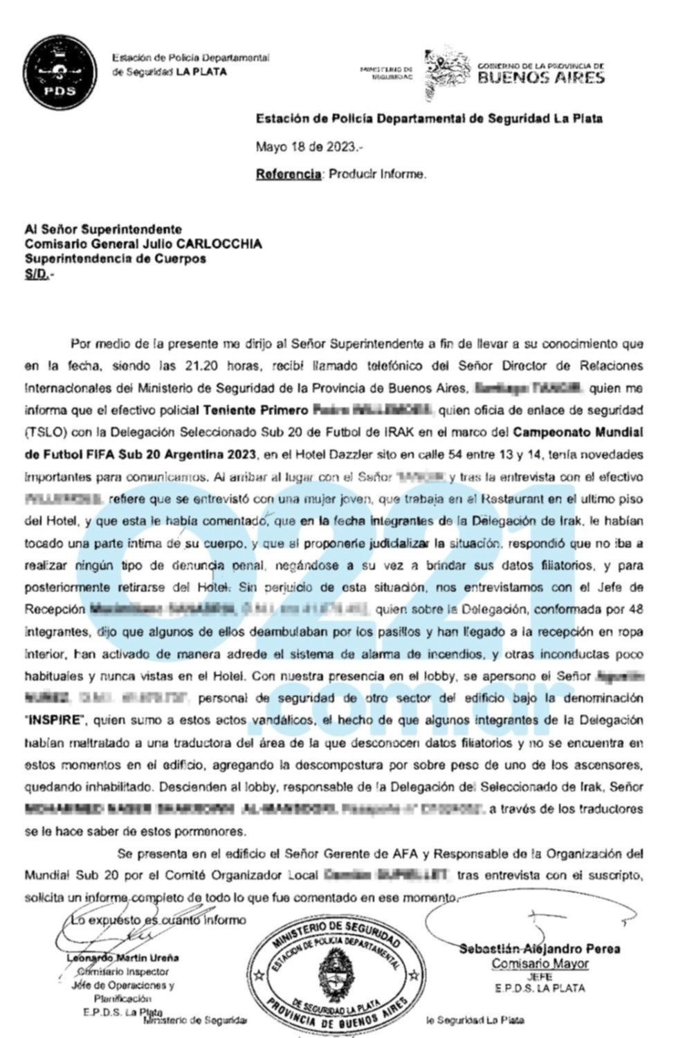 Horas después este medio tuvo acceso a un detallado informe elaborado por las autoridades policiales que intervinieron en el caso, en el que no solo se indica cómo fue el presunto ataque descrito por la trabajadora del hotel, sino también una larga lista de desmanes que los miembros de la delegación iraquí llevaron adelante en las instalaciones del complejo.