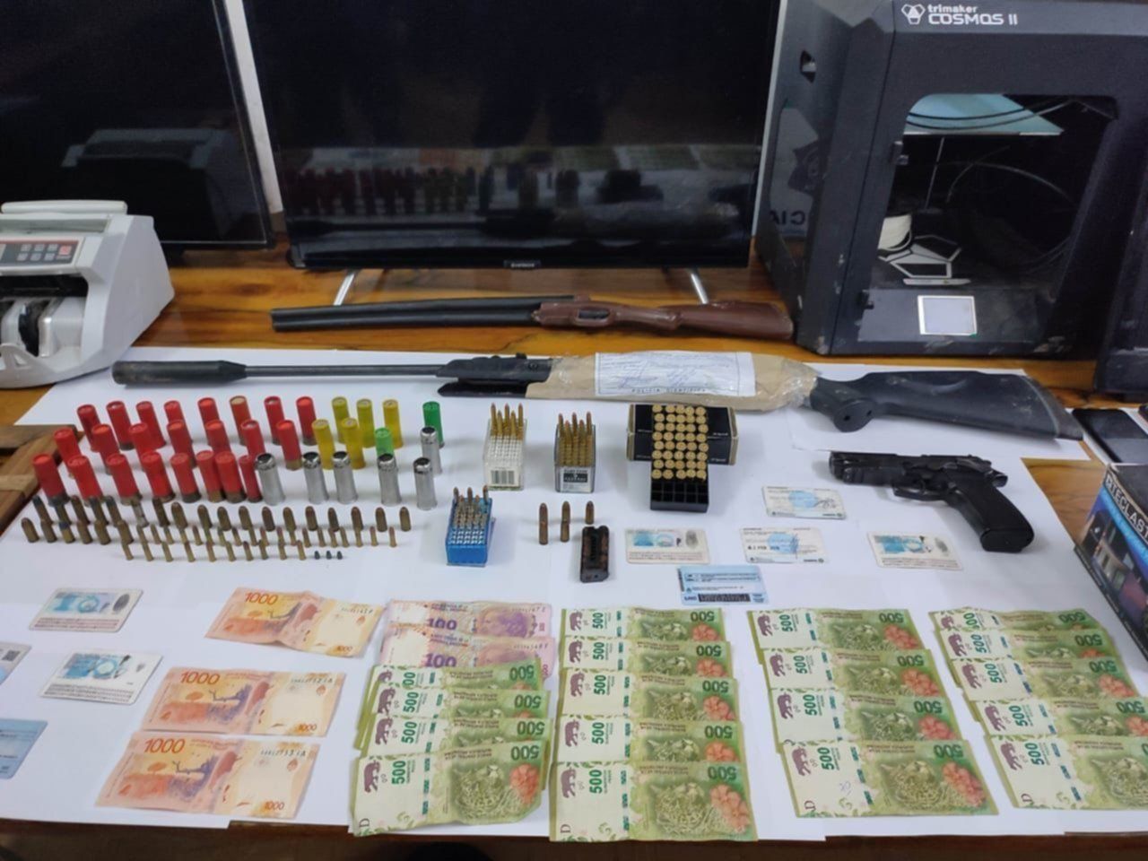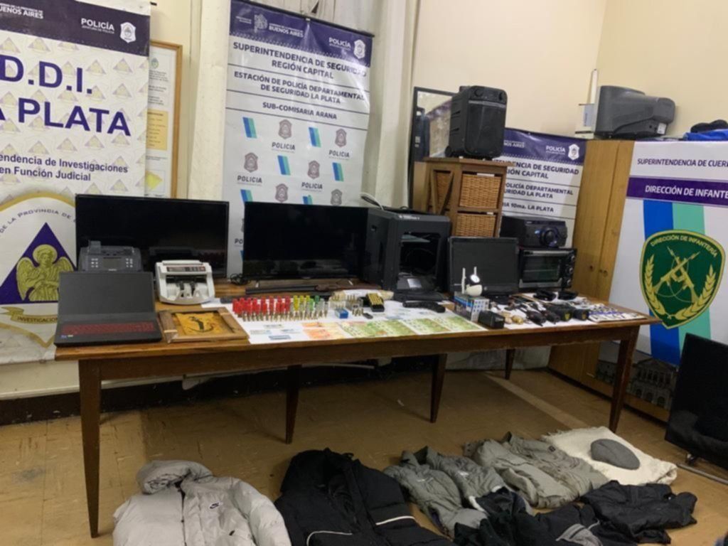 Y como se indicó, las autoridades encontraron un cuantioso botín producto de varios robos perpetrados en la zona norte de La Plata. Allí había dinero en efectivo, electrodomésticos, computadoras, impresoras 3D, tres televisores, muebles, espejos, cuadros, armas y municiones.