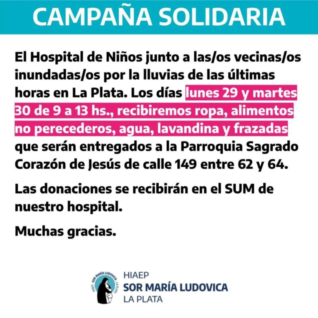 Y las autoridades el Hospital de Niños Sor María Ludovica también se pusieron a disposición de los frentistas afectados, por lo que anunciaron que el próximo lunes 29 y el martes 30 de 9 a 13 recibirán en el SUM del centro de salud ropa, alimentos no perecederos, agua, lavandina y frazadas que serán entregados luego en la Parroquia Sagrado Corazón de Jesús de 149 entre 62 y 64.