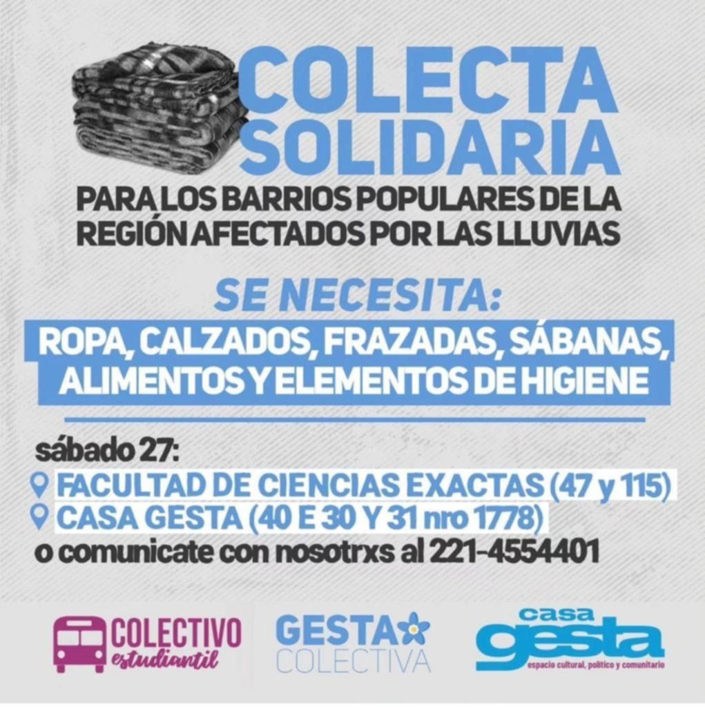 En la misma línea, el Colectivo Estudiantil y Gesta Colectiva anunciaron también la realización de una colecta solidaria "para los barrios populares de la región afectados por las lluvias" y adelantaron que se necesita con más urgencia ropa, calzados, frazadas, frazadas, sábanas, alimentos y elementos de higiene", por lo que este sábado recibirán todo tipo de donaciones en la Facultad de Ciencias Exactas (47 y 115) y Casa Gesta (40 N° 1778 entre 30 y 31).