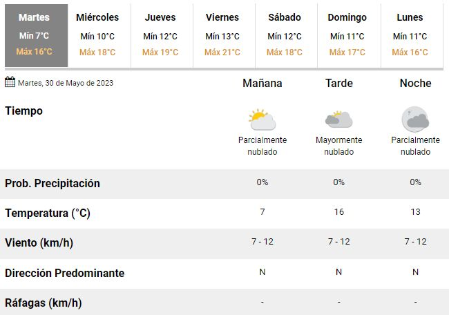Los expertos pronostican un leve ascenso de la temperatura hasta el fin de semana. Gracias al ingreso de un frente de aire más cálido proveniente desde el norte, los meteorólogos prevén que las mínimas comiencen a subir levemente y se ubiquen entre los 10 y 13°C y las máximas entre los 18 y 21°C.