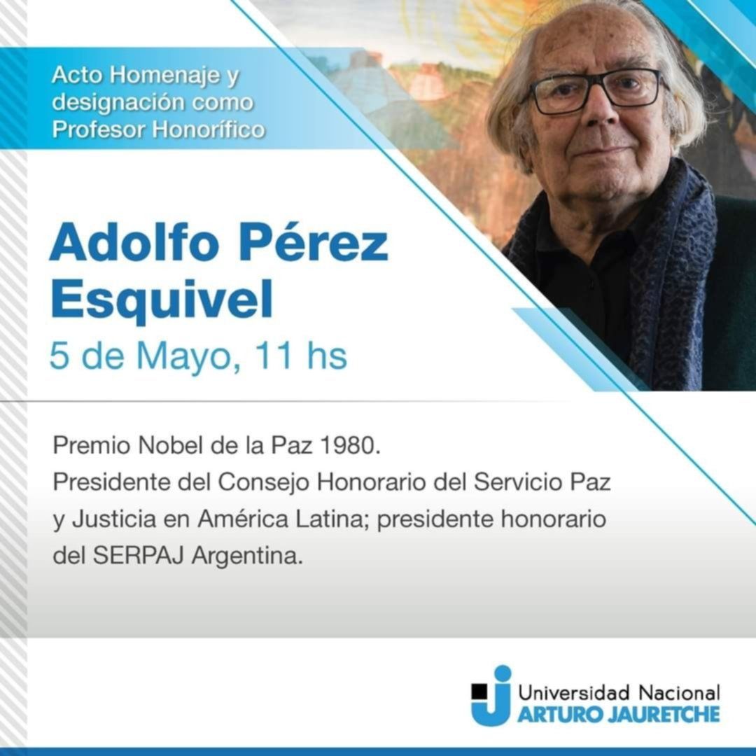 La Universidad Nacional Arturo Jauretche realizará un acto de homenaje y designación como Profesor Honorífico a Adolfo Pérez Esquivel, ganador del Premio Nobel de la Paz en 1980. El evento se llevará a cabo el día 5 de mayo desde las 11 en la Sala del Consejo Superior de esa casa de estudios ubicada en Calchaquí 6200, de Florencio Varela.