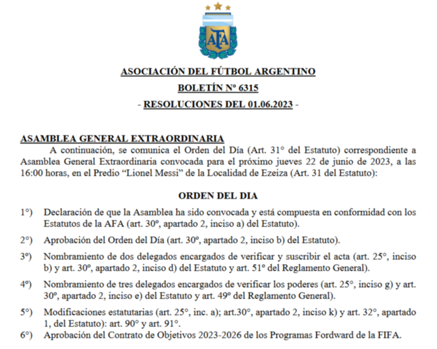 La noticia mueve al mundo del fútbol. La convocatoria fue realizada a través del Boletín Nº 6315. En ella, el quinto inciso de la Orden del Día destaca las modificaciones del estatuto aprobado el año pasado que tiene por objetivo final achicar la Primera División para que en 2029 la conformen 22 equipos.