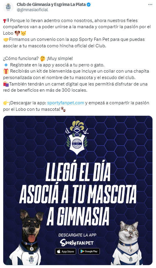 "A partir de hoy nuestros fieles compañeros tendrán la posibilidad de asociarse al Lobo. Los triperos y las triperas podrán compartir con sus perros y gatos la pasión por Gimnasia", confirmó la institución en las redes sociales. La novedosa iniciativa tiene como protagonista a la app Sporty Fan Pet y permite asociar a los animales desde cualquier parte del mundo.