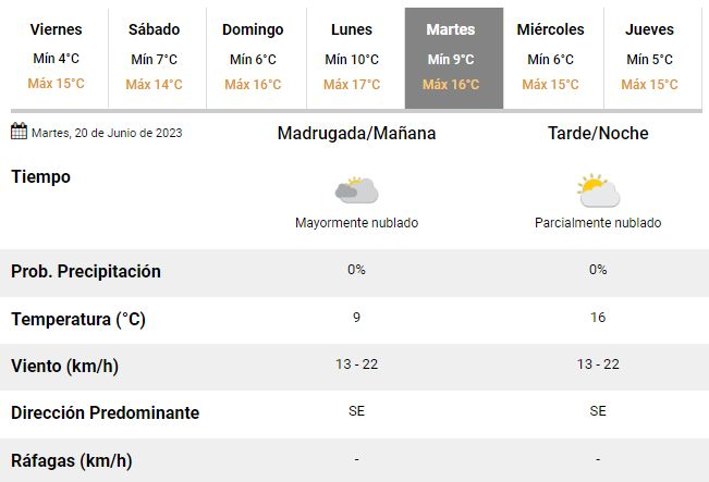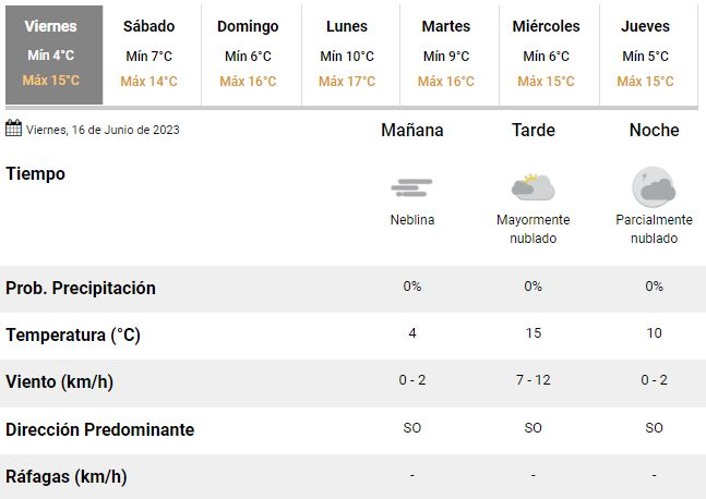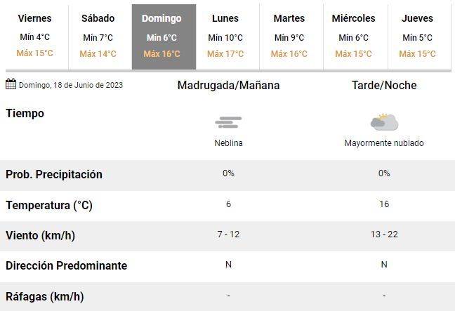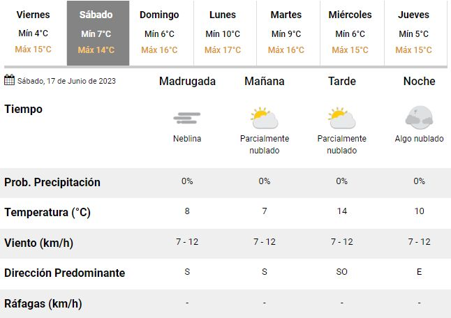En ese marco, en el SMN anticipan un sábado parcialmente nublado y con algo de sol, acompañado de una temperatura que oscilará entre 7 y 14°C y dará paso a un domingo con vientos soplando desde el norte, una mínima de 6°C y una máxima de hasta 16°C en el marco de otra jornada con abundante nubosidad.