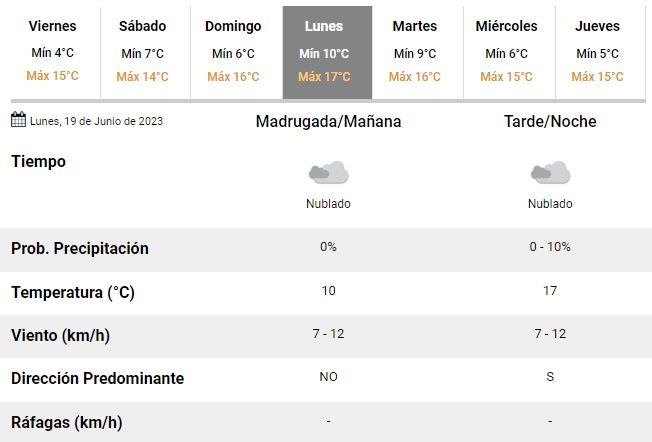 Para los últimos dos días de descanso, el feriado puente del lunes y el Paso a la Inmortalidad del general José de San Martín que se celebrará el próximo martes, los expertos pronostican un clima similar: temperaturas en aumento y oscilando entre 9 y 17°C, cielos mayormente nublados y vientos rotando al sur, lo que volverá a traer consigo un descenso de las temperaturas.