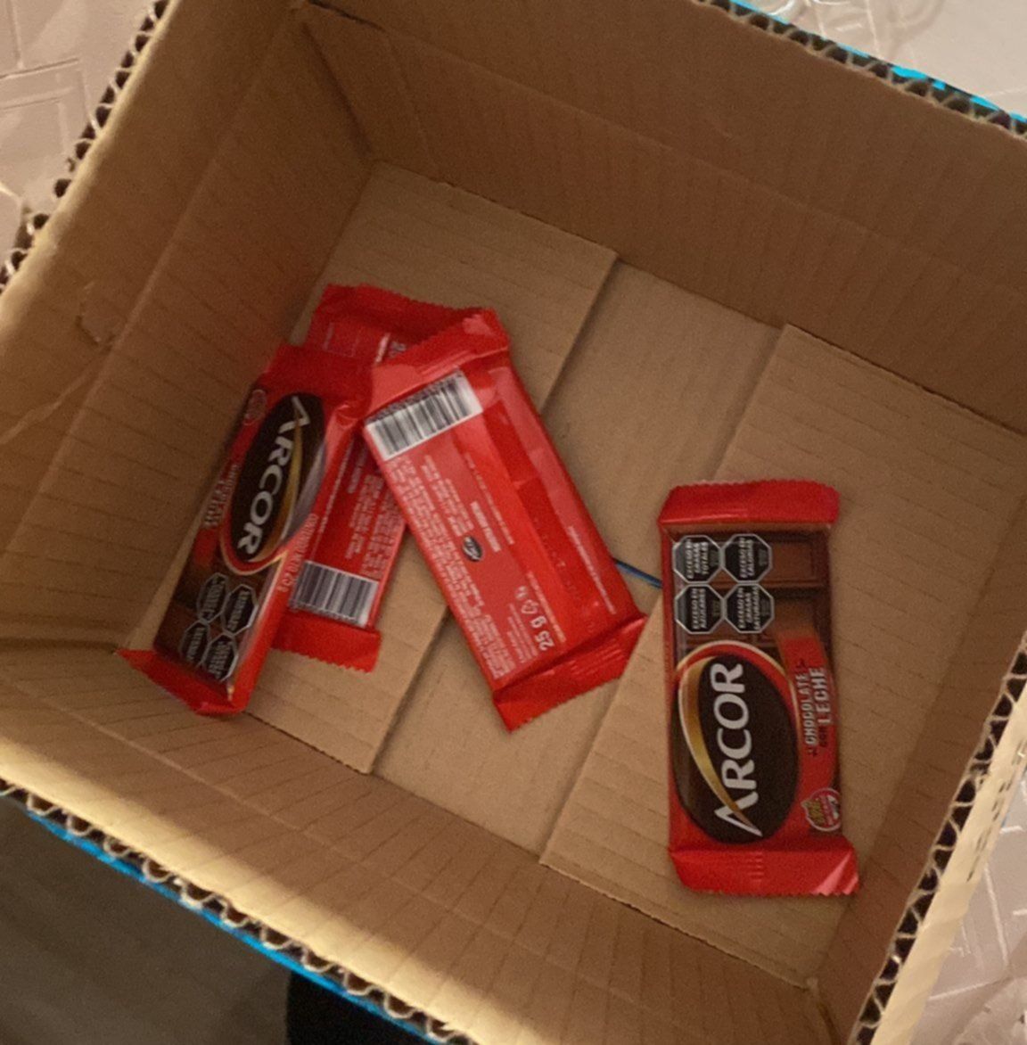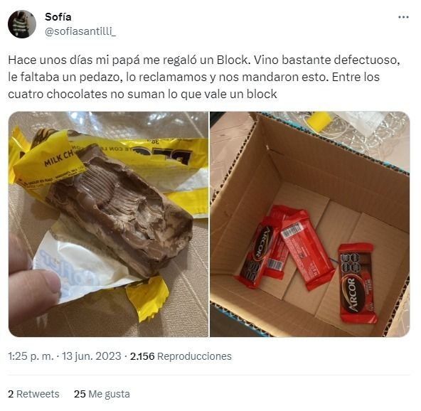 "Hace unos días mi papá me regaló un Block. Vino bastante defectuoso, le faltaba un pedazo, lo reclamamos y nos mandaron esto", escribió en su cuenta personal de Twitter (@sofiasantilli_), donde muestra que a modo de recompensación por el defecto les dieron cuatro tabletas de chocolate que juntas "no suman lo que vale un Block", según dijo la joven.