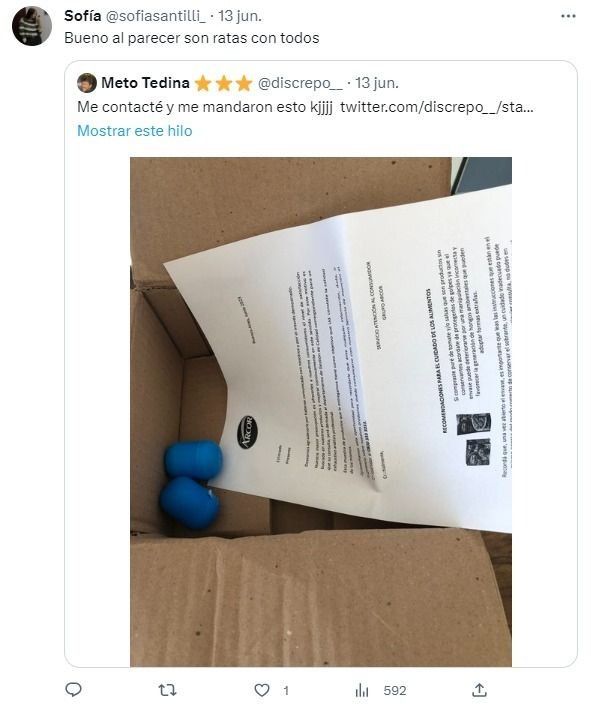 En medio de la indignación, escribió otro tuit acusando a la empresa de "ratas". "Tanto te costaba mandar el mismo producto? No te vas a fundir por regalar un Block", disparó furiosa.