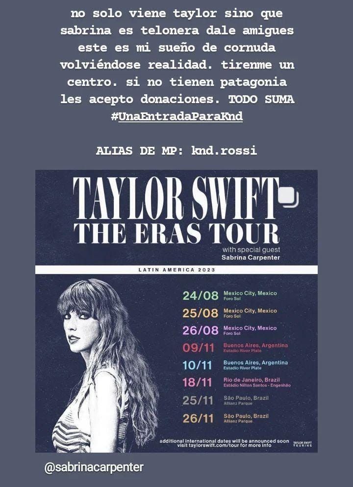 Hay quienes van aún más lejos, como el caso de una fanática nos hizo llegar su posteo en Instagram y bajo el hashtag #UnaEntradaParaKnd, lanzó una campaña en busca de algún alma bondadosa que le permita adquirir la entrada a través de su cuenta bancaria. Pero el petitorio no queda ahí, sino que siguiendo el lema "todo suma", también dice aceptar donaciones y comparte su Alias.