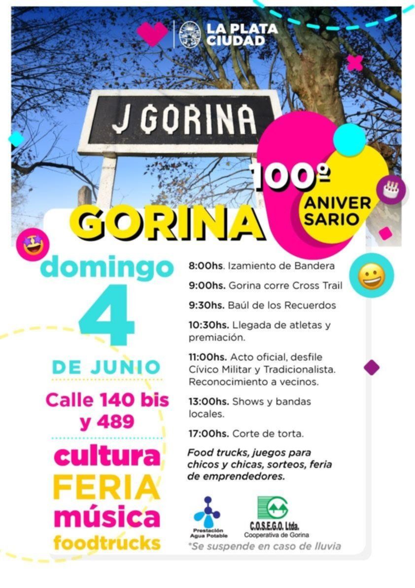 Pero la celebración seguirá el domingo 4 de junio, cuando se llevará a cabo el evento central del 100º aniversario, que iniciará con el tradicional izamiento de bandera e incluirá también la iniciativa "Gorina Corre Cross Tail", una competencia deportiva que propone recorrer diferentes senderos de la zona.