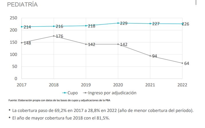 En ese marco, 0221.com.ar accedió a los datos oficiales que encendieron las alarmas en la cartera que conduce Nicolás Kreplak. Del informe se desprende que en la especialidad pediatría la cobertura paso de 62,2% (cupo de 214 y un ingreso de residentes de 148) en 2017 a 28,8% (solo 64 sobre 226 cupos) en 2022, el año de menor cobertura del período. El pico positivo, en tanto, se registró en 2018 con un 81,5% (176 sobre 216).