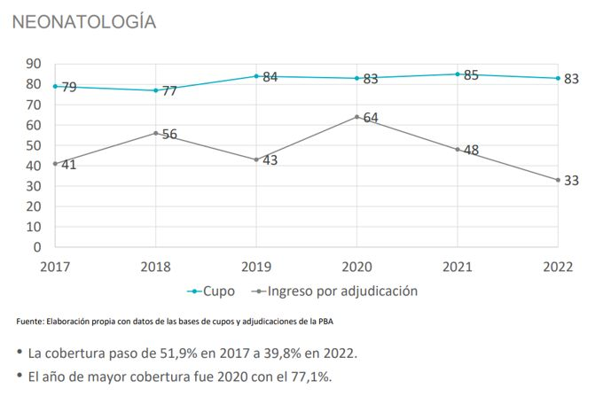 De acuerdo con este relevamiento, en neonatología también se observan datos preocupantes: la cobertura pasó de 51,9% en 2017 a 39,8% en 2022. El año de mayor cobertura fue 2020 con el 77,1%.