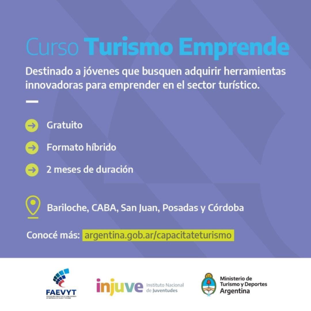 El Ministerio de Turismo y Deportes de la Nación, junto con la Federación Argentina de Asociaciones de Empresas de Viajes y Turismo (Faevyt) y el apoyo del Instituto Nacional de Juventudes (INJUVE), lanzó Turismo Emprende, una propuesta de formación intensiva para estudiantes y jóvenes que formen parte del sector. Los interesados en participar pueden ingresar a la página del MTYD.