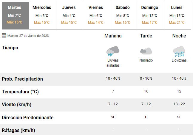 En el SMN anticipan un día gris y prevén que la mayor chance de lloviznas se de hacia la noche. Los especialistas anticipan vientos leves a moderados de entre 7 y 22 km/h soplando mayormente desde el sudeste acompañados de mucha humedad.