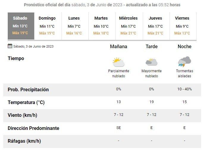 Ya para el lunes volverá a brillar el sol, con un descenso de la temperatura. Se esperan 7°C para la mañana y una máxima de 16°C para el resto de la jornada.