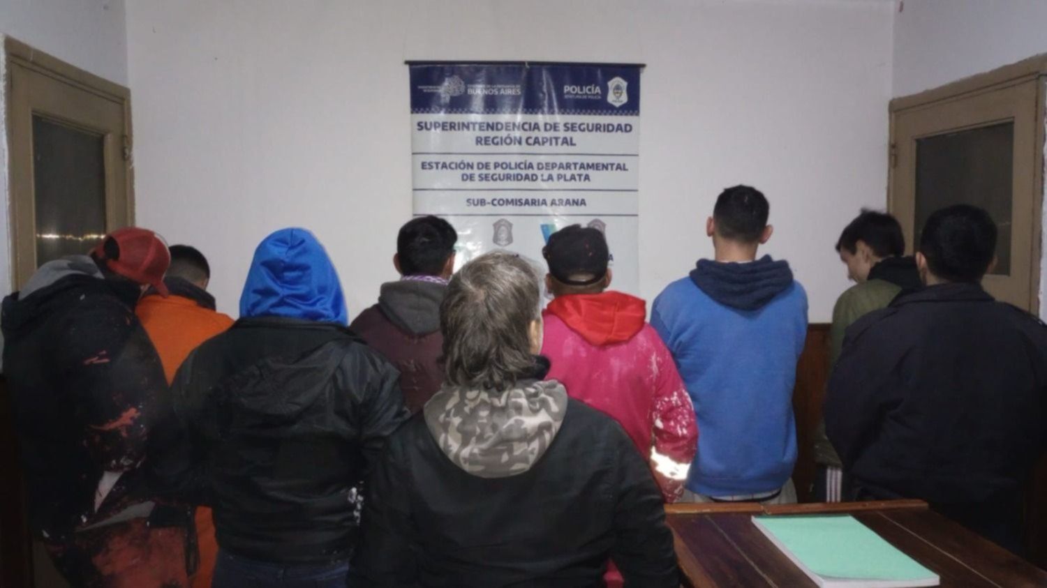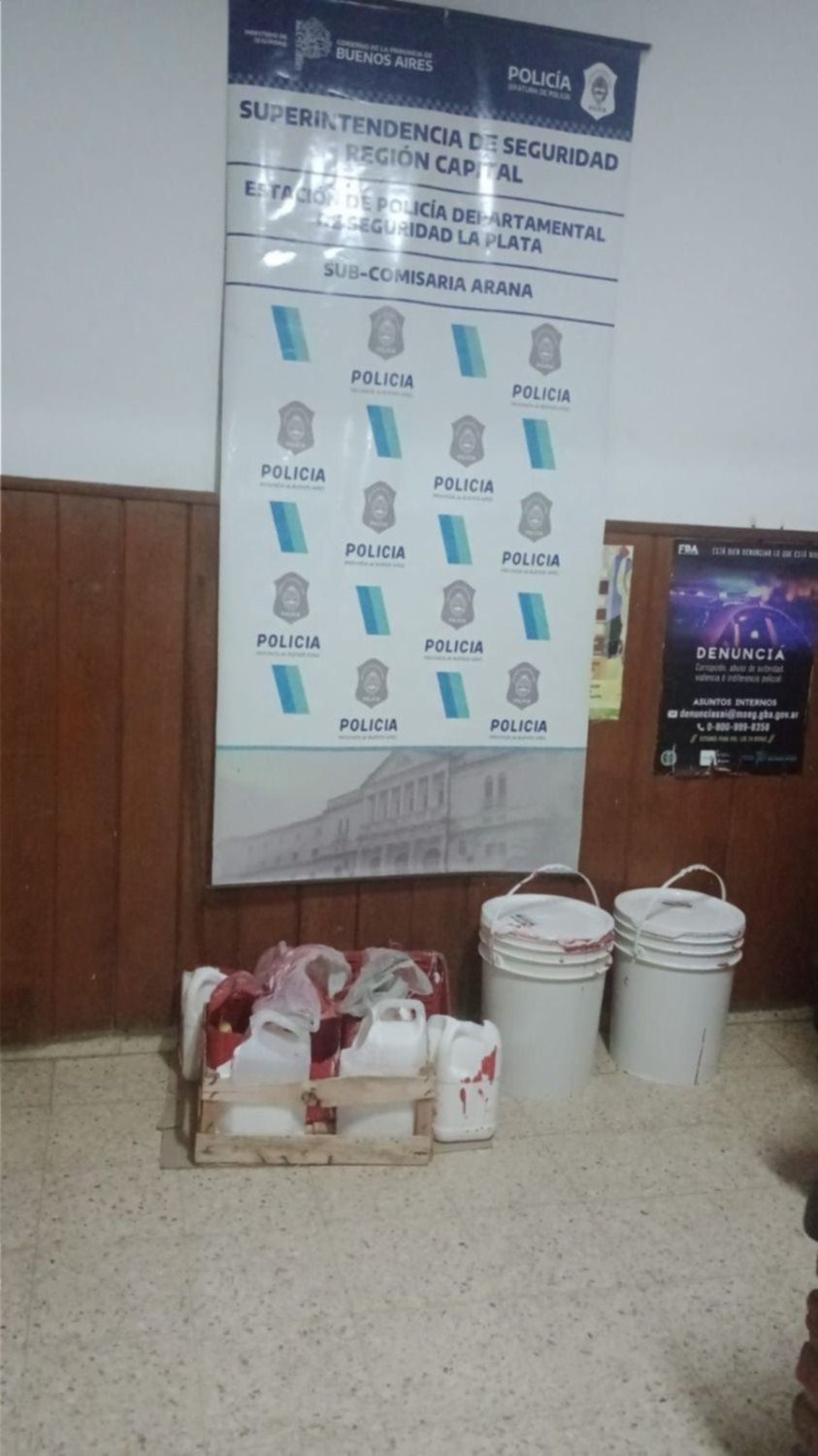 Los efectivos policiales procedieron a la detención de los nueve implicados identificados como R.I.S (38); G.P.M. (29); R.E.E. (29); C.L. (28); C.M.A. (47); C.L. (28); G.E. (29); L.G.D. (46) y E.S.M. (19), que fueron trasladados al Destacamento Policial Arana. En el lugar se secuestraron dos baldes de pintura, bidones que se utilizaron para el fraccionamiento de la primera, pinceles y rodillos.