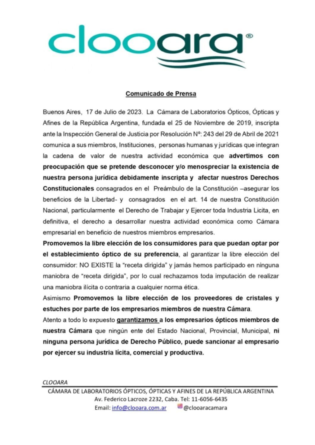 "Proveemos la libre elección de los consumidores para que puedan optar por el establecimiento óptico de su preferencia, al garantizar del consumidor: NO EXISTE la “receta dirigida” y jamás hemos participado en ninguna maniobra de “receta dirigida", indicaron en CLOOARA en medio de la disputa y agregaron que por ello rechazan "toda imputación de realizar una maniobra ilícita o contraria a cualquier norma ética".