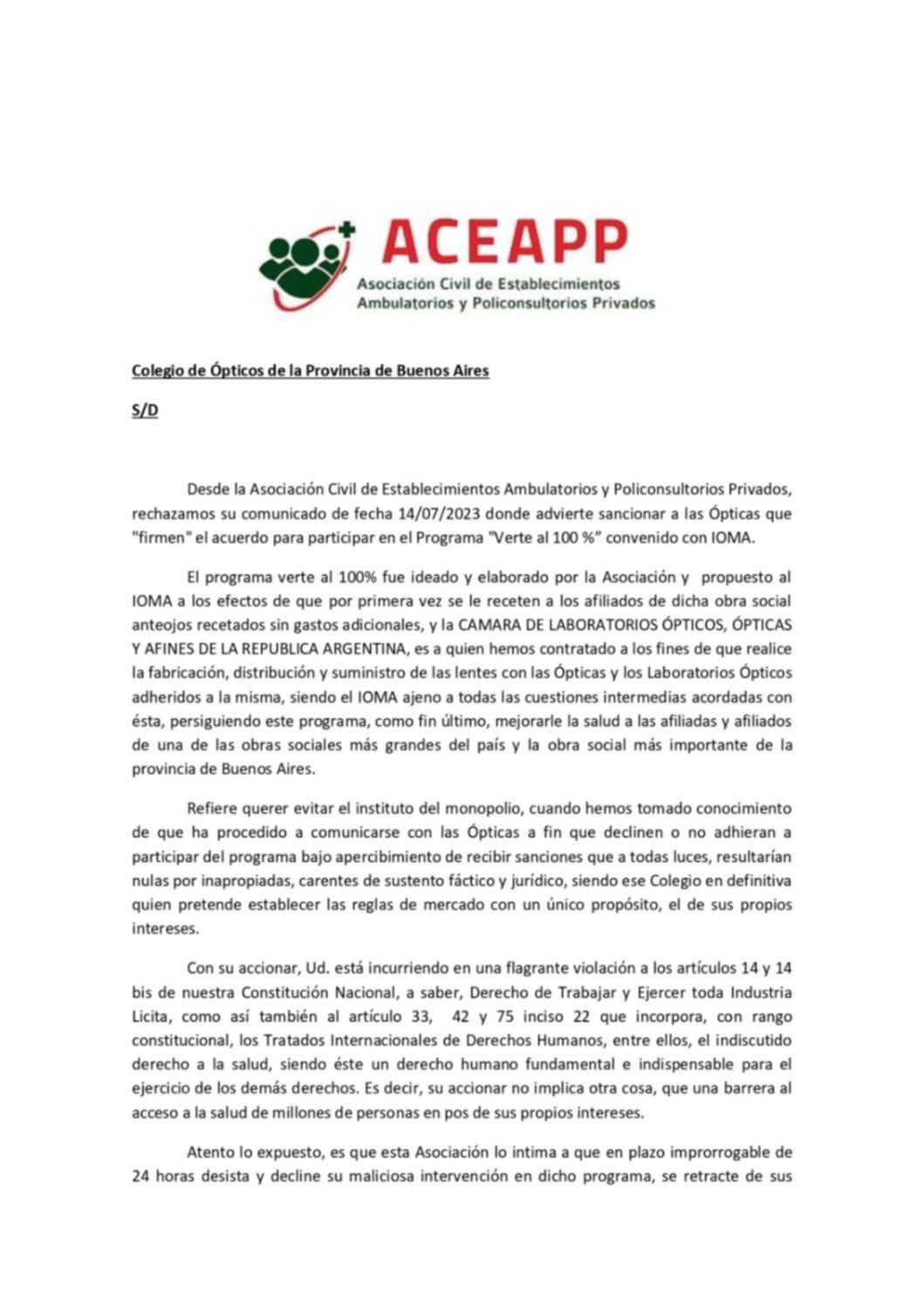 Ahora, sin embargo, la Asociación Civil de Establecimientos Ambulatorios y Policonsultorios Privados (ACEAPP) y la Cámara de Laboratorios Ópticos, Ópticas y Afines de la República Argentina (CLOOARA) enviaron una fuerte carta documento al Colegio de Ópticos de la Provincia de Buenos Aires en las que ambas instituciones aclaran que "no hay ningún tipo de irregularidad administrativa" y agregan que, por el contrario y como sucede con "todo convenio con entidades provinciales", el acuerdo por el plan "Verte al 100" pasó por "todos los organismos jurídicos de control".