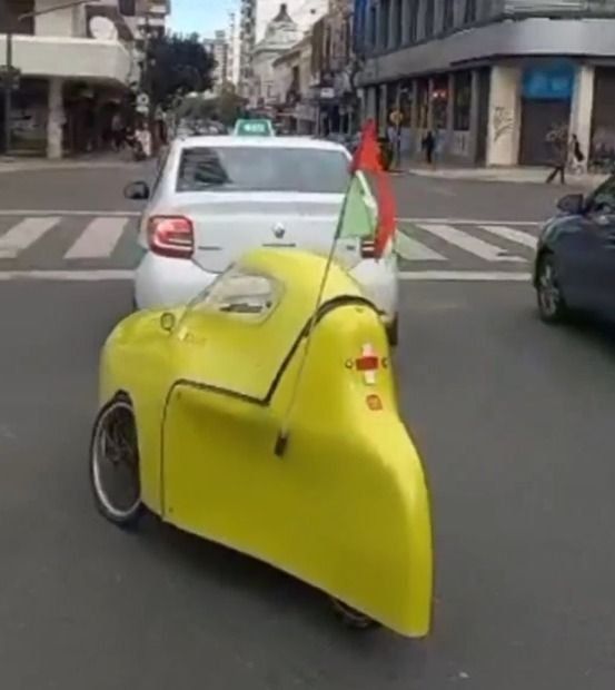 La extraña silueta amarilla aparece por la calle 50 entre 6 y 7, justo frente al emblemático Pasaje Dardo Rocha, y sorprende a todos los que en ese momento de la mañana del sábado transitan las calles del microcentro de La Plata. La pregunta quedó flotando en el aíre. ¿Qué es?, ¿un vehículo a motor?, ¿una bici o triciclo a pedales?, ¿o algún otro dispositivo electrónico o de otro tipo lo hace circular con absoluta comodidad en medio del resto de los autos convencionales?