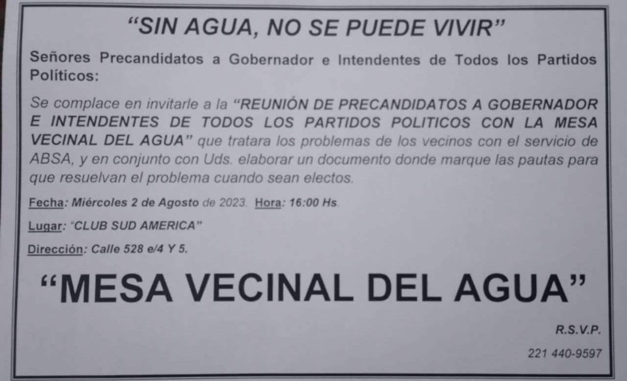 En ese marco, los vecinos buscan aprovechar la campaña preelectoral y convocan a los candidatos platenses a un encuentro para discutir el tema a una "reunión de precandidatos a gobernador e intendente de todos los partidos políticos" con la denominada "mesa vecinal del agua. La cita es para el próximo miércoles 2 de Agosto a las 16 en el Club Sud America de la calle 528 e/4 y 5.
