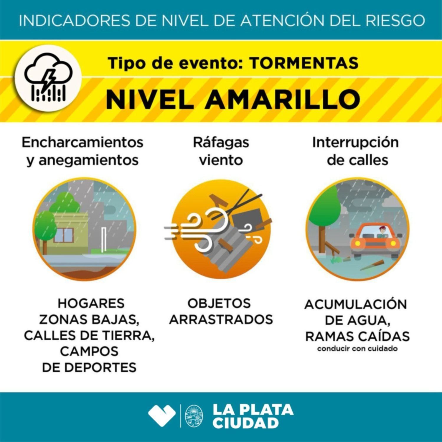 "Esta noche se activarán tormentas de variada intensidad sobre La Plata" y "alguna puede ser de fuerte intensidad y corta duración, con ráfagas y ocasional granizo", dice el reporte emitido por la Comuna. En este marco, el Municipio puso en marcha un plan de acción que cuenta con el trabajo articulado de las distintas áreas comunales y contempla tareas de monitoreo y control para evitar inconvenientes.
