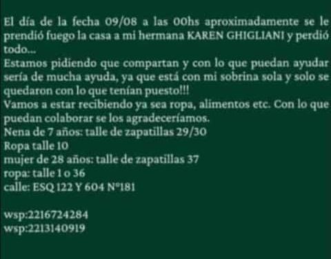 Una de sus hermanas se comunicó con 0221.com.ar para informar que la víctima sufrió la pérdida de todas sus pertenencias. "Estamos pidiendo que compartan y con lo que puedan ayudar sería de mucha ayuda, ya que está con mi sobrina sola y solo se quedaron con lo que tenían puesto", expresó.