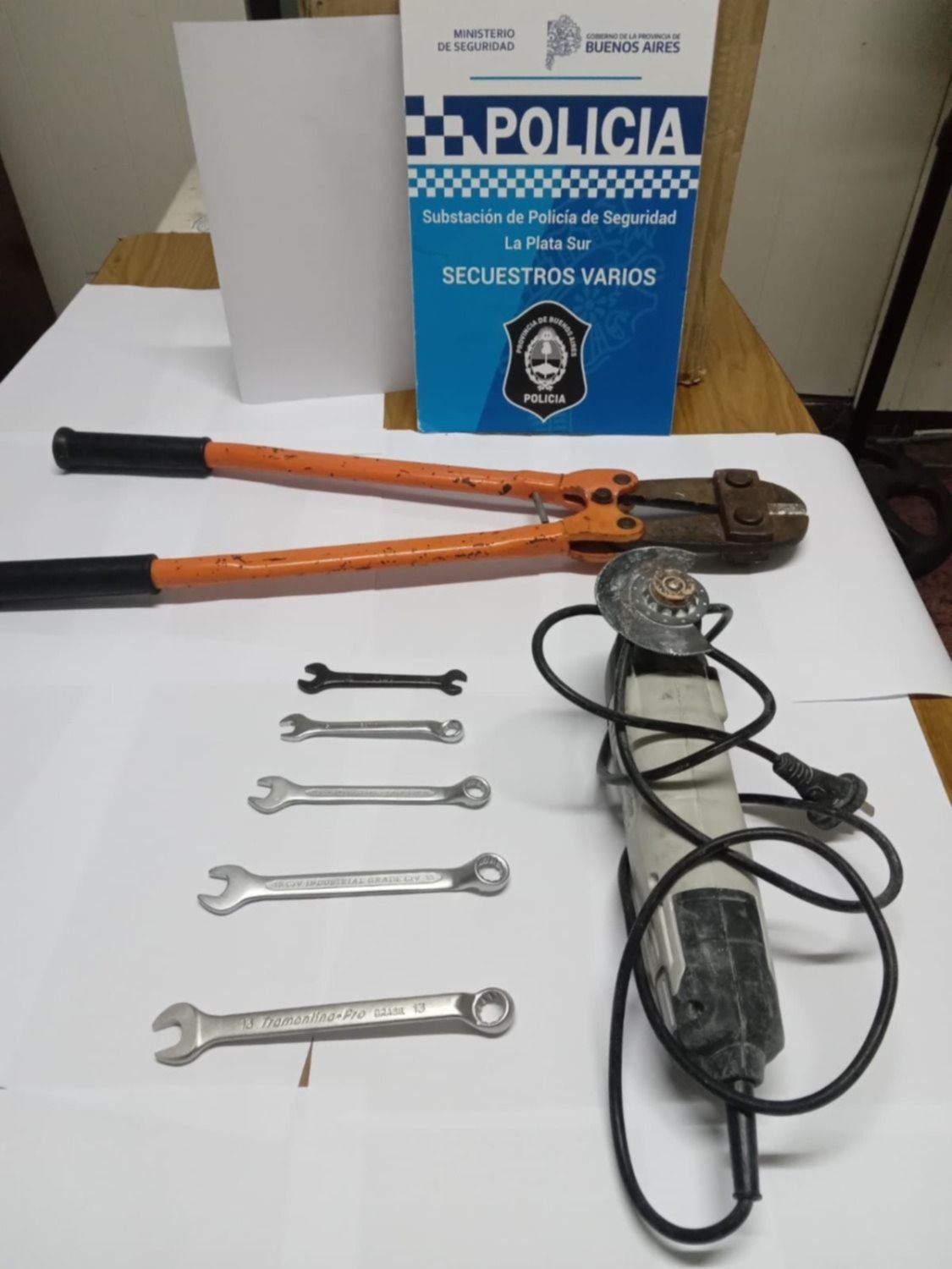 De acuerdo con los informes policiales, los efectivos incautaron una tijera naranja marca "N-1-NUDO", una amoladora marca "SALKORPRO" y cinco llaves de medidas 9, 10, 11 y 13 milímetros.