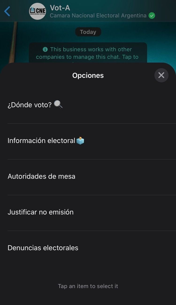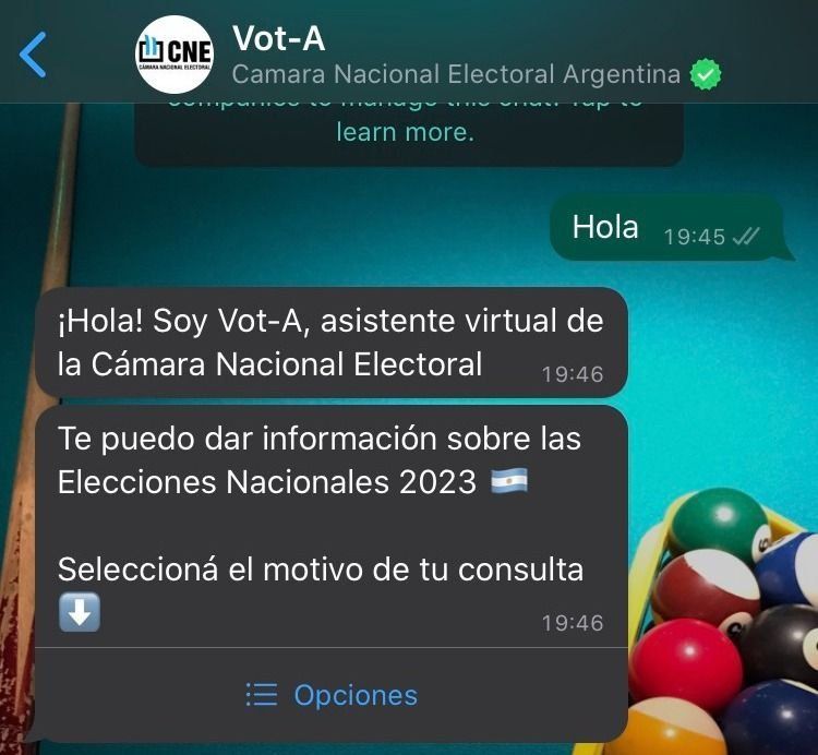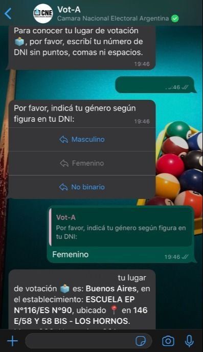 Pero esta no es la única función del chatbot, según explicó Gustavo Mason, el subdirector general de la CNE: "Este número de contacto de WhatsApp se creó para que el ciudadano pueda tener en su celular un modo ágil y práctico de consultar el lugar de votación". En esa línea destacó que el asistente también ayuda a justificar la no emisión del voto, a realizar denuncias electorales en caso de algún incidente y a acceder a las capacitaciones para autoridades de mesa. Entre otros datos útiles para tener en cuenta el día de la elección, el chatbot de la CNE recuerda que el horario de votación es de 8 a 18, aunque siempre se recomienda no dejar el trámite para último momento.