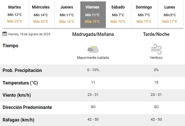 Todo será la antesala de un fin de semana frío a templado, con una temperatura oscilando entre 7 y 15°C el sábado y 7 y 19°C el domingo, ya sin lluvias en el horizonte y la vuelta, al menos de a ratos, del sol.