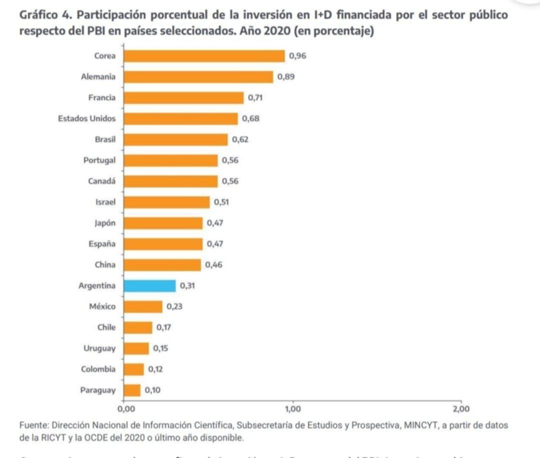 Otros científicos e investigadores argumentaron por qué el candidato no debe cerrar o privatizar la ciencia. Es el caso de Daniel Schteingart, director de Planificación Productiva del centro de investigación Fundar quien mostró un gráfico en el que se puede observar el porcentaje del Producto Bruto Interno que invierten países como Corea del Sur, Alemania, Estados Unidos, Brasil o Canadá. Todos ellos invierten más que Argentina en Investigación y Desarrollo.