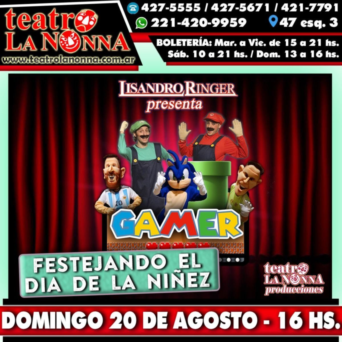 A las 16, Gamer: La obra invita a acompañar a Lalo, un niño que por desperfectos técnicos se mete dentro de sus videojuegos favoritos. Ante su asombro deberá ganar todas las vidas para volver al mundo real, ayudado por todos los conocidos personajes que hay dentro de su consola, logrando superar diferentes niveles, hasta regresar a casa.