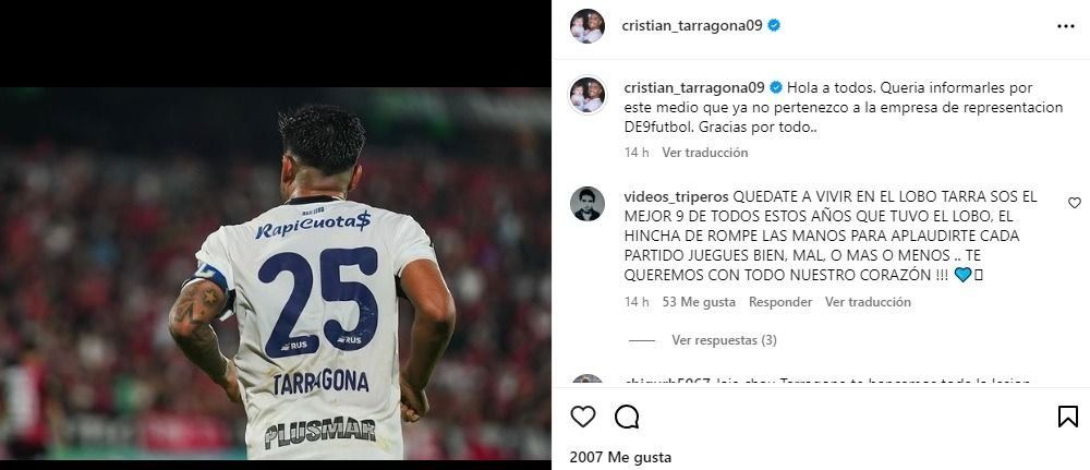 “Quería informarles por este medio que ya no pertenezco a la empresa de representación DE9fútbol. Gracias por todo”, fueron las palabras del delantero en el posteo que realizó en sus redes sociales, dando cuenta de la separación con la empresa de representación con la que se encontraba trabajando hasta el momento.