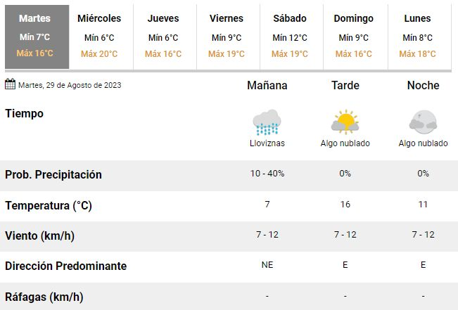 La semana sigue en La Plata con un martes de buenas condiciones, muy fresco por la mañana y con una tarde agradable y soleada. Así lo anticipa el SMN para nuestra región: una temperatura mínima de 7°C y una máxima de 16°C, con una humedad del 89% y viento soplando del noreste a 5 km/h.