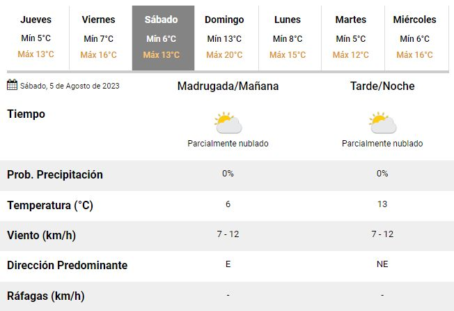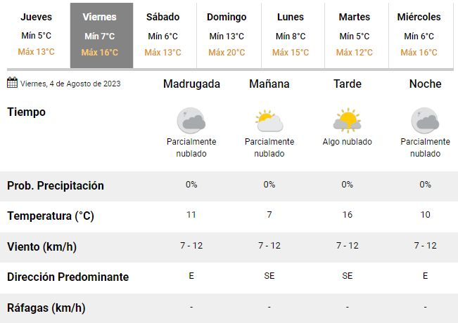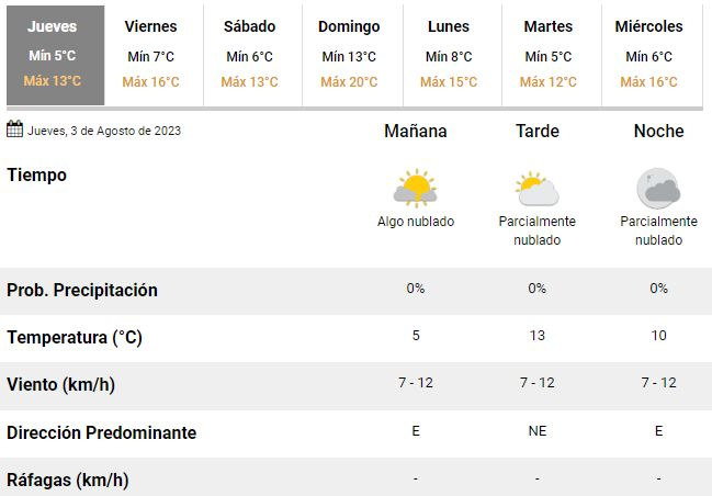 Con cielo parcialmente nublado y viento sur soplando a 13 km/h, la jornada estará muy fresca durante la mañana y con algo más de temperatura a la tarde, momento en que se llegará a una máxima de 13°C.