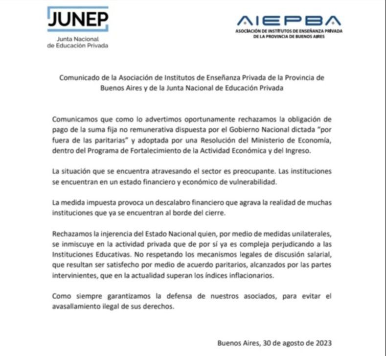 "Comunicamos que como lo advertimos oportunamente rechazamos la obligación de pago de la suma fija no remunerativa dispuesta por el Gobierno Nacional dictada ‘por fuera de las paritarias’ y adoptada por una Resolución del Ministerio de Economía, dentro del Programa de Fortalecimiento de la Actividad Económica y del Ingreso", escribieron en conjunto la Junta Nacional de Educación Privada (JUNEP) y la Asociación de Institutos de Enseñanza Privada de la Provincia de Buenos Aires (AIEPBA).