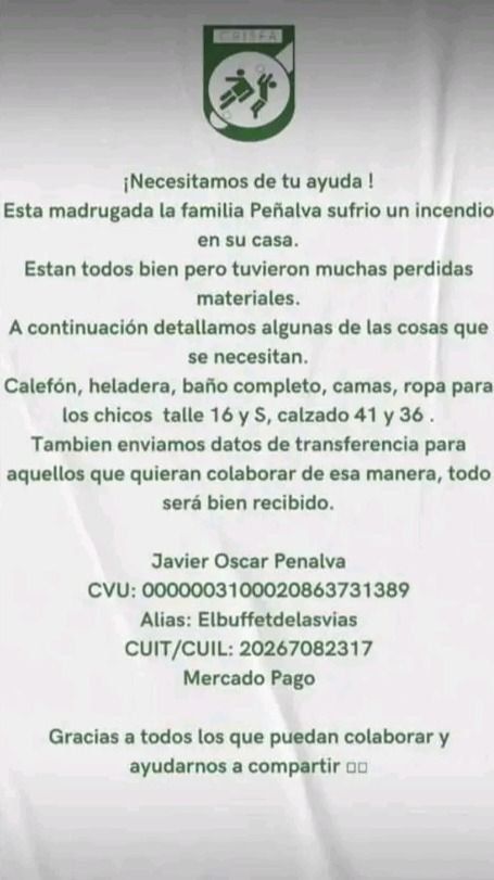 Además se puede colaborar enviando dinero al CVU: 0000003100020863731389 o al alias de Mercado Pago "Elbuffetedelasvias". La cuenta está a nombre de Javier Oscar Peñalva. El club y la familia agradecen la colaboración y la difusión de la campaña.