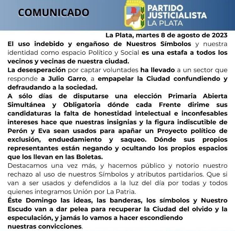 "La desesperación por captar voluntades ha llevado a un sector que responde a Julio Garro a empapelar la ciudad confundiendo y defraudando a la ciudad", dice el comunicado que agrega que "los símbolos y atributos partidarios serán usados a la luz del día por quienes integramos Unión por la Patria".