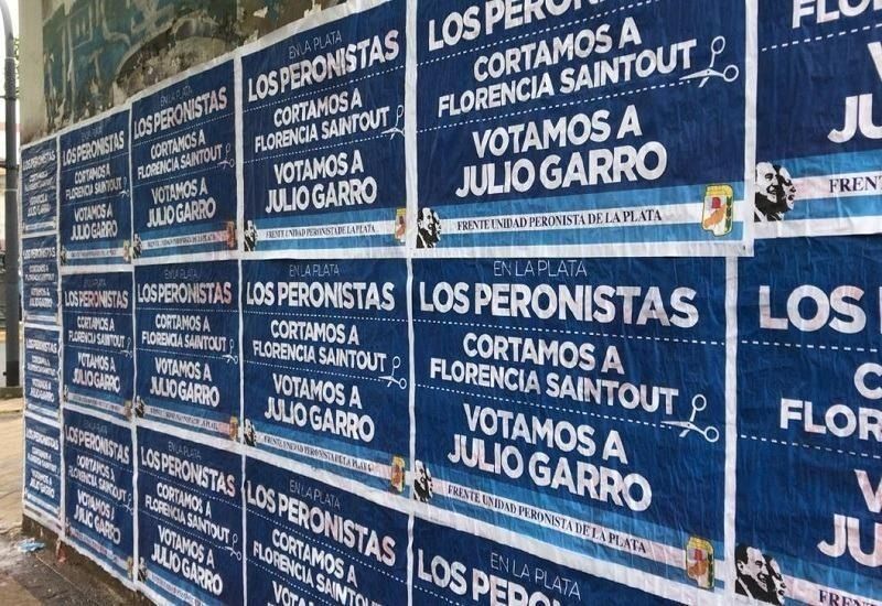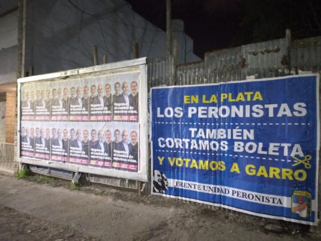 "En La Plata los peronistas también cortamos boleta y votamos a Garro", dice el texto de los afiches que recuerdan a otros muy similares impulsados por el mismo sector en 2019, en los que llamaban explícitamente a cortar la boleta de la entonces candidata del Frente de Todos, Florencia Saintout para colocar en el sobre las del intendente.