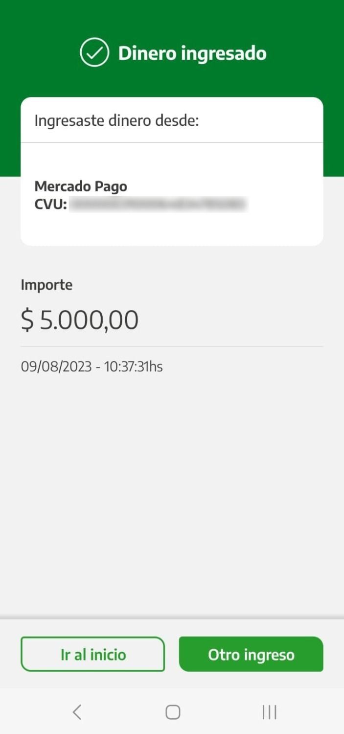 Una vez hecha la operación, Cuenta DNI confirma el ingreso.