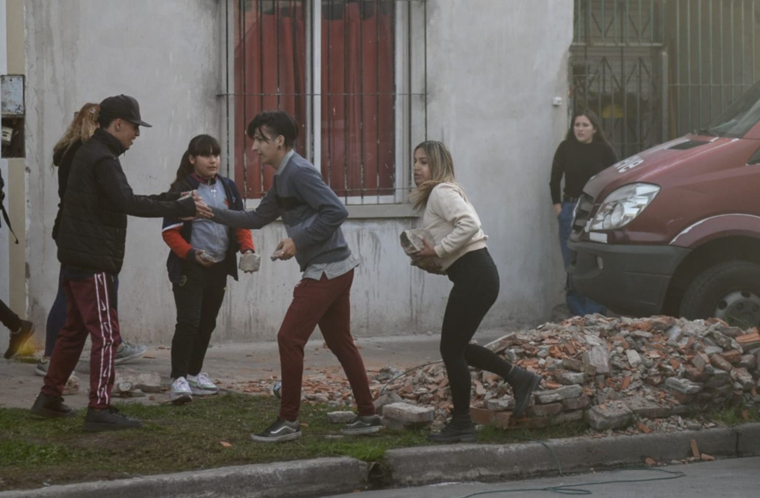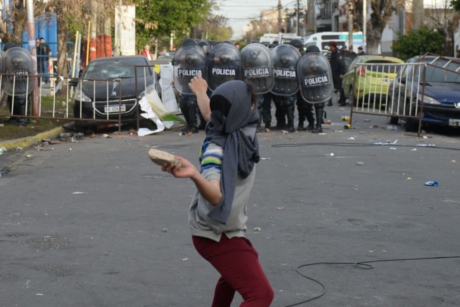 En horas de la tarde, cerca de las 17.30, nuevamente algunos de ellos volvieron a arrojar piedras y escombros que dieron en los escudos de los efectivos de la Guardia de Infantería. Ante esa situación, los policías avanzaron por calle Warnes y desalojaron a los manifestantes.