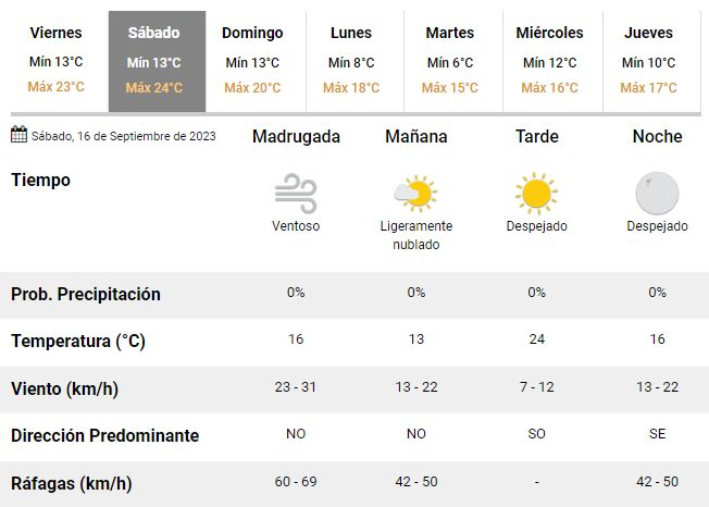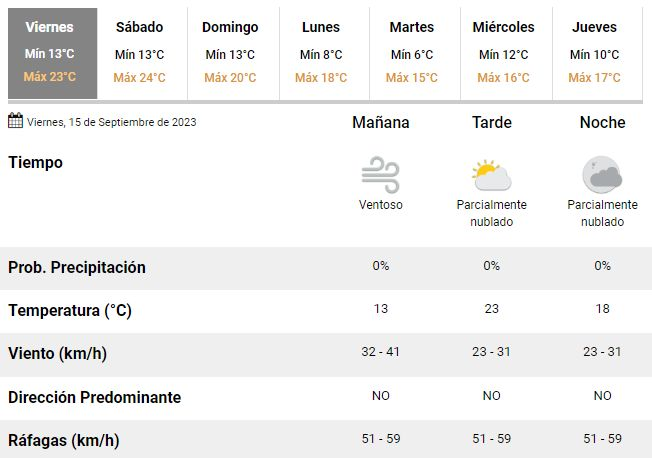 De acuerdo con las previsiones de los meteorólogos argentinos, este viernes transcurrirá sin contratiempos y con una temperatura de entre 13 y 23°C. Será un verdadero día primaveral tanto en La Plata como en el resto de la región, aunque con intensos vientos soplando casi constantemente a velocidades de entre 23 y 41 km/h soplando desde el noroeste.