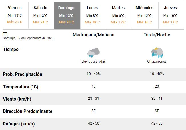El domingo, por su parte, será completamente diferente a los días previos: los meteorológos prevén un día inestable y no descartan la posibilidad de que se registren algunas lluvias y chaparrones aislados desde la mañana y hasta entrada la tarde. El día transcurrirá nublado, ventoso y con una temperatura oscilando entre 13 y 20°C.