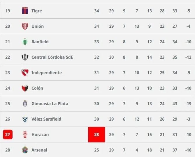 Según lo dispuesto, el equipo que menos puntos obtenga al final de la LPF perderá la categoría y si este justo coincide con aquel con el peor promedio, como sucede hoy con Arsenal, bajará el que ocupe el puesto 27° de la tabla anual. En ese marco, en posición de descenso se encuentra Huracán, con 28 puntos, pero el Tripero no está lejos y es que se encuentra el puesto 25° con apenas 2 puntos más y solo por encima de Vélez que tiene el mismo puntaje.