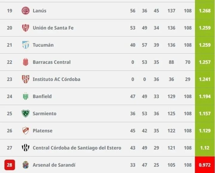 Encima de Gimnasia, por su parte, permanecen por ahora Independiente y Colón (31), Central Córdoba de Santiago del Estero (32) y Banfield (33), entre otros.