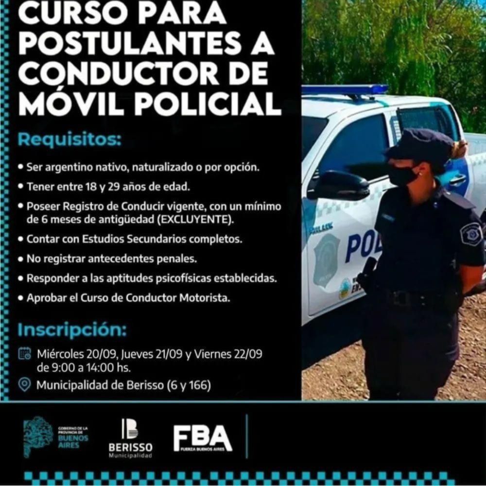 El Ministerio de Seguridad de la provincia de Buenos Aires y el Municipio de Berisso abrieron la inscripción para el reclutamiento de conductores de patrulleros. El objetivo es sumar aspirantes al puesto de "Conductor de móvil policial", para el cual se brindará un curso gratuito de capacitación.