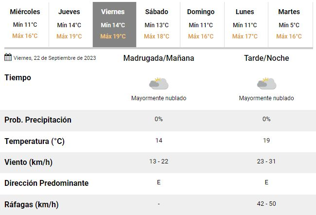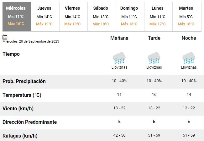 A un día del comienzo de la primavera, la semana sigue en La Plata con un miércoles gris y lloviznas. La humedad es de casi el 100% y se espera que sople viento este a velocidades de entre 13 y 22 km/h, con algunas ocasionales ráfagas que incluso podrían alcanzar hasta 59 km/h.