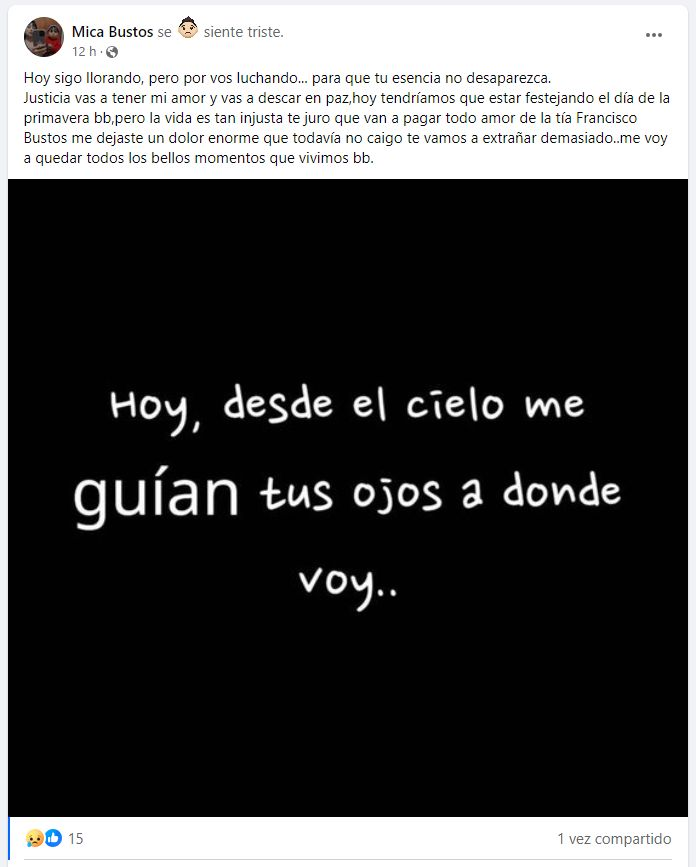 A horas del triste desenlace y con gran pesar, la hermana de Alejandro Bustos y tía del pequeño fallecido escribió un conmovedor mensaje para despedir a su sobrino: "Hoy sigo llorando, pero por vos luchando... para que tu esencia no desaparezca", publicó en su cuenta de Facebook Micaela Bustos.