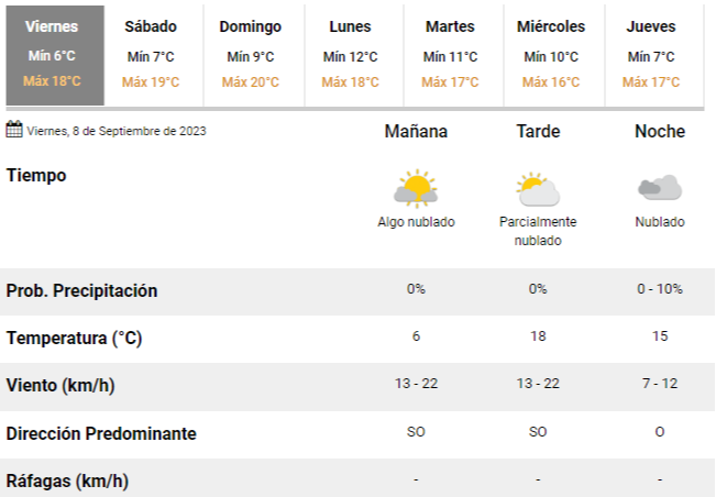 El SMN pronostica para esta jornada una mañana muy fresca y una tarde de 18°C, con cielo parcialmente nublado, una humedad del 96% y vientos leves rotando del sudoeste al oeste, soplando a una velocidad de entre 7 y 22 km/h.